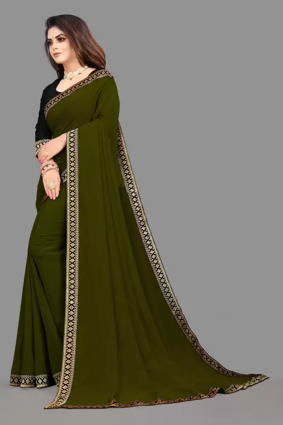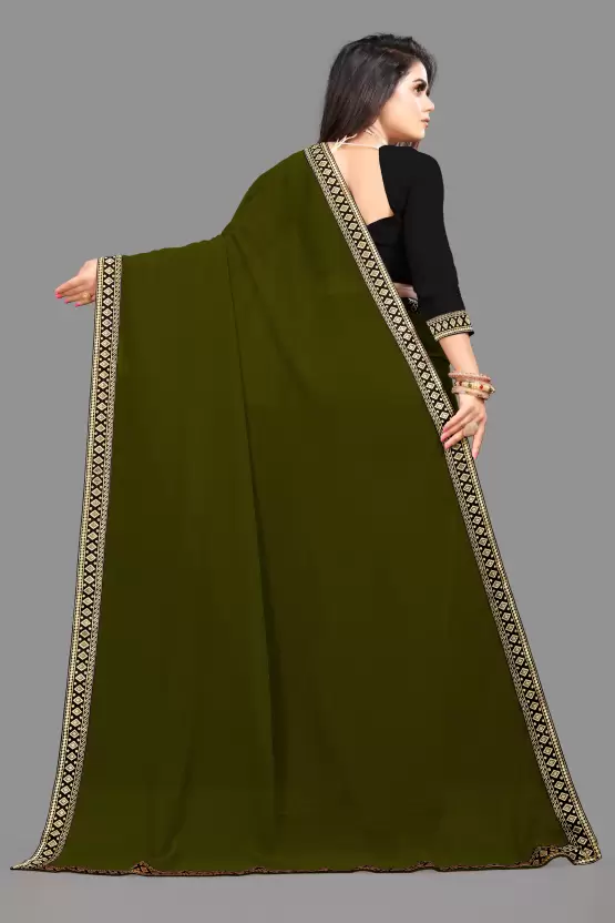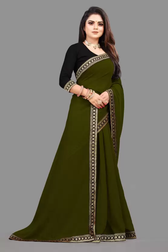 Elegant Mehendi Green plain georgette saree with embroidered lace border. Comes with matching art silk blouse piece. Lightweight, flowy drape — ideal for parties, weddings, and festive gatherings.