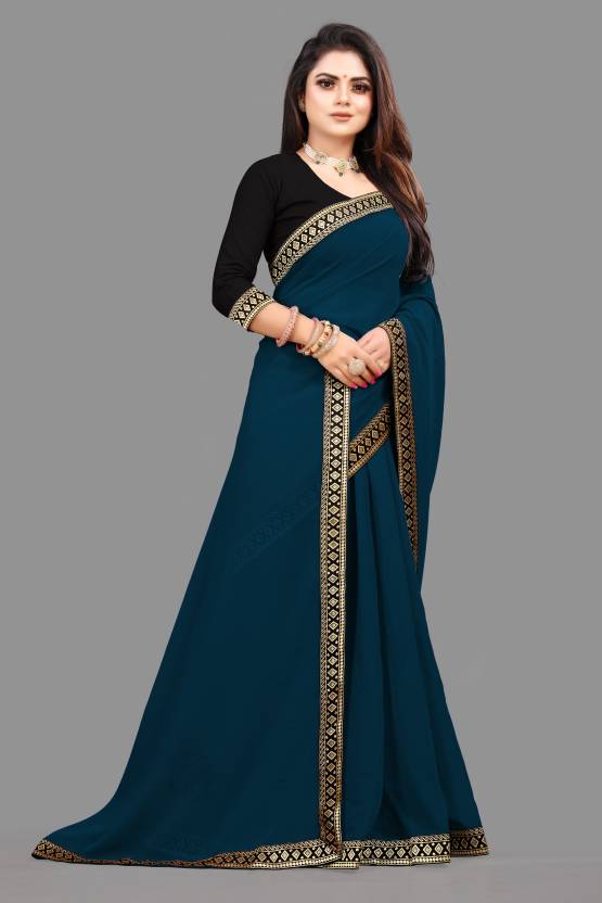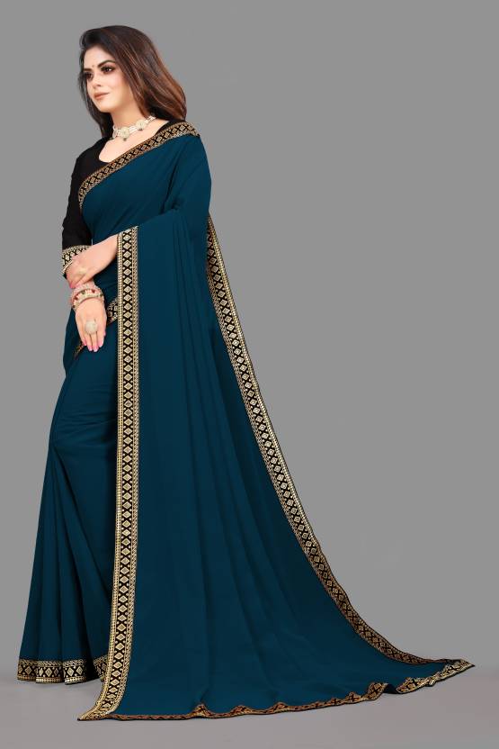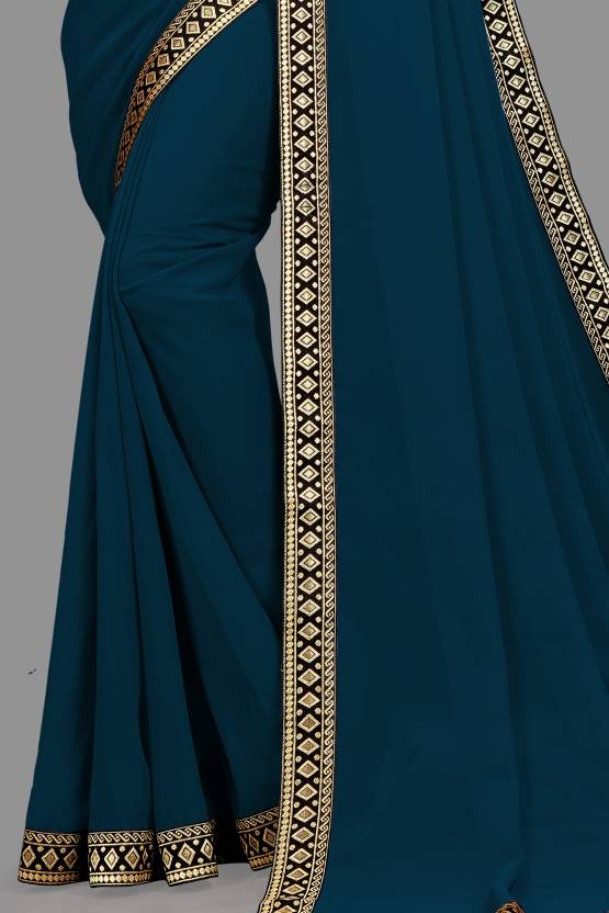 Elegant Morpich Teal plain georgette saree with embroidered lace border. Comes with matching art silk blouse piece. Lightweight, flowy drape — ideal for parties, weddings, and festive gatherings.
